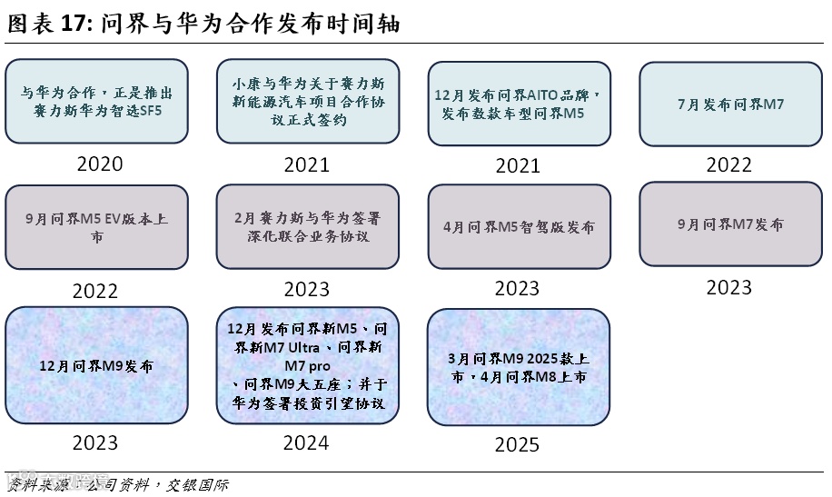 智能高端阶段(2021年至今):2021年起携手华为,发布智选SF5和全新高端品牌“问界”。先后推出问界M5、M7、M9、M8等多款智能车型,2022年公司更名为“赛力斯”,快速跻身国内高端新能源头部阵营。