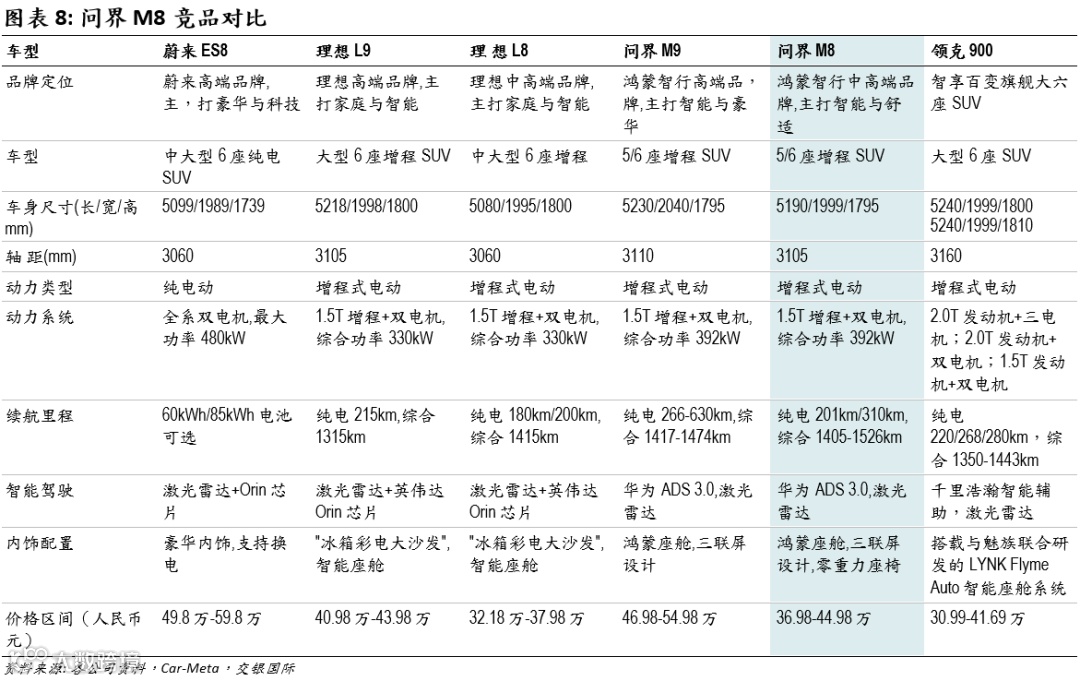 新能源车型中,问界M8主要竞品包括理想L8、理想L9、领克900,及更高价位的问界M9和蔚来ES8。与理想和领克车型相比,问界M8在智能化、 品牌力、空间等方面具备一定优势;而与问界M9和蔚来ES8相比,其具备性价比优势。问界M8填补了30-40万元SUV细分市场问界车型的空白,有望从30-40万元SUV以及部分40-50 万元SUV市场抢夺市场份额。综合来看,我们认为,问界M8有望成为细分市场第一。