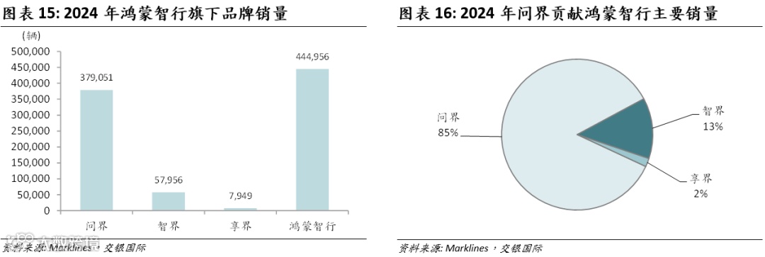 相比其他智选车模式的品牌,问界在品牌认知度、产品完成度、消费者口碑和销量表现上均处于领先地位,成为“华为智选车”模式中最具代表性的成功样本。特别是问界M7和M9的热销,充分验证了“华为定义+赛力斯制造”的高效协同模式,使其成为华为智选车战略落地的标杆案例。2024年全年,鸿蒙智行累计交付新车444,956辆,其中,问界系列贡献了379,051辆,占比高达85.2%;智界全年销量约57,956辆,占比约13%;享界仅为7,949辆,占比1.8%,体现出问界的显著领先地位。