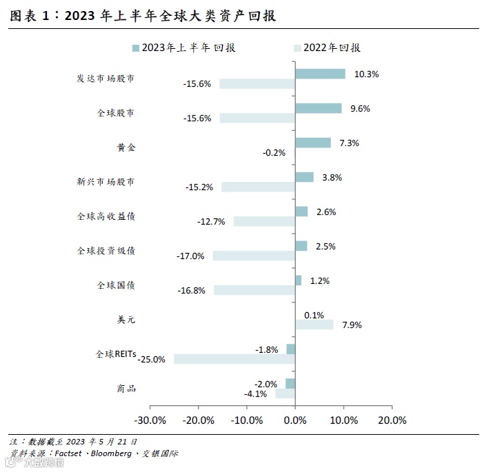 复盘2023上半年全球大类资产的表现,大部分风险资产类别都较2022年有了可观的修复。随着全球经济从疫情后逐渐走向正轨,美元与黄金的收益不再遥遥领先,取而代之的是以发达市场为主的股市。而全球REITs和商品虽较2022年跌幅收窄,但依旧录得负收益。