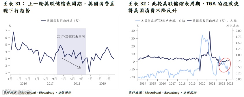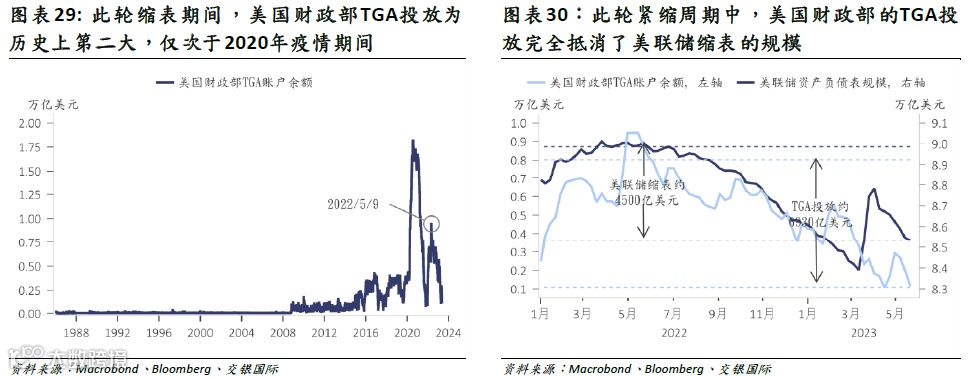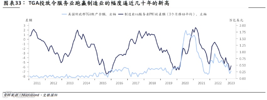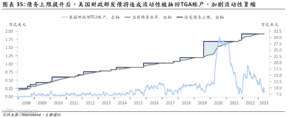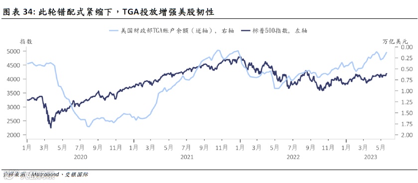 目前市场对美联储降息预期为2023年三季度,而我们认为在结构性因素扰动下,降息不会早于四季度——市场需对此重新定价。叠加美国财政部TGA投放,过去1年部分冲销了此轮错配式紧缩的冲击。市场普遍关注美国债务违约,而我们认为更重要在于TGA账户变化。随着债务上限抬高,财政部TGA投放将从现阶段的对冲紧缩逆变为加剧紧缩,这使得2023年下半年,美国宏观环境额外承压、行业风险不断发酵,市场将经历更加漫长的阵痛期。