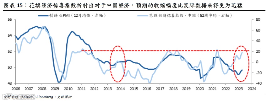 这意味着,纵使当前的宏观大盘弱于2013-2014年且复苏路径同样渐进而缓慢,但当前的预期仍然显得过低,进而令经济惊喜指数(实际-预期)仍然被动被推升至高位水平。