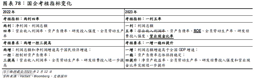 2023年的政府工作报告中,着重强调了国有企业“提质增效”,而在2023年1月,国资委则已要求2023年中央企业原先“一利五率”的考核目标修改为“一增一稳四提升”,这一修改也从微观层面体现了质>量: