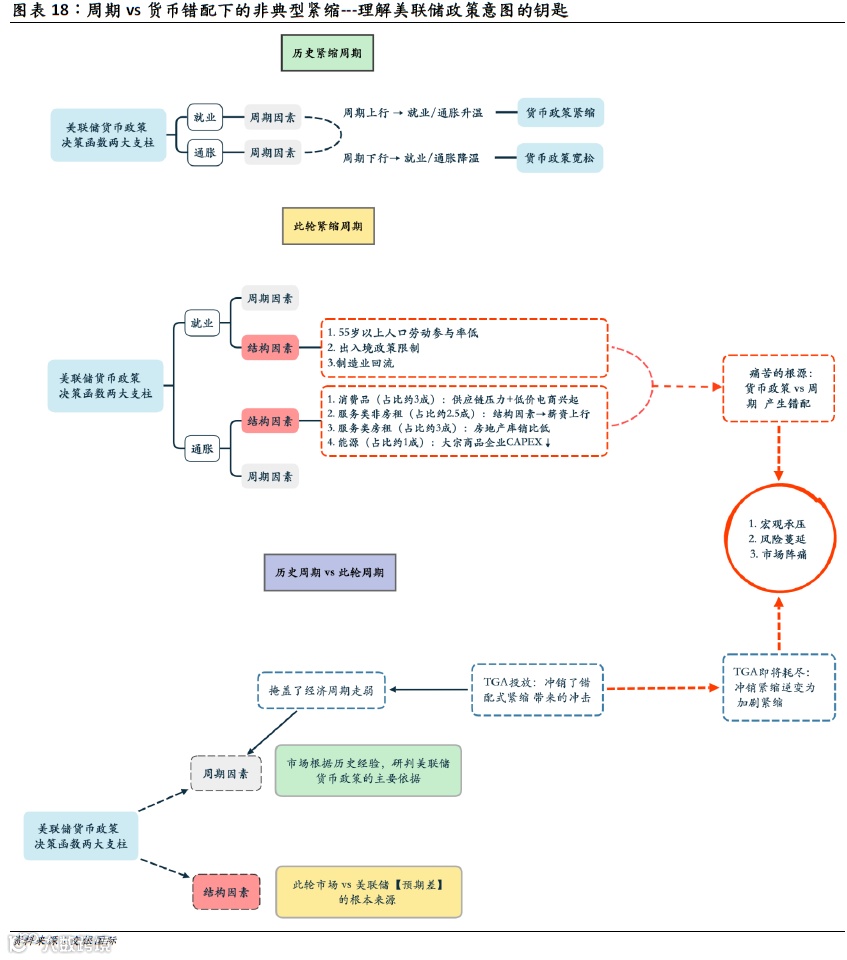 这一轮紧缩周期与历史上的紧缩周期不尽相同。此轮紧缩周期中,美联储货币政策决策函数中就业、通胀两大支柱都各自深受结构性因素扰动,令经济周期与美联储的货币政策形成错配,是一次周期vs货币错配下的“非典型紧缩”。这正是美联储决策痛苦的根源,也是市场持续误判联储货币政策的核心驱动。