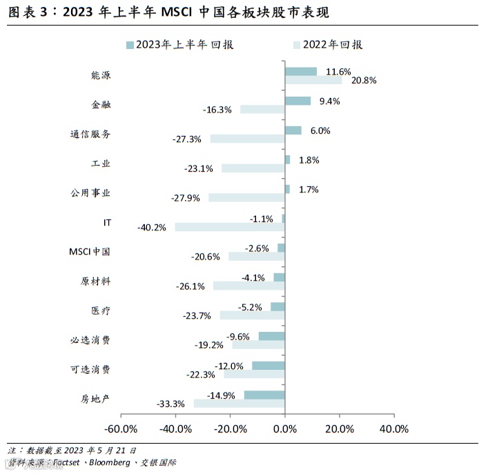 2023上半年MSCI中国指数的板块分化依然明显,能源、金融等周期板块领跑市场,整体取得两位数的收益,其次为在数字经济以及人工智能主题推动下的通信服务板块。表现最差的则是地产板块,虽然上半年地产的销售数据已经有所修复,但市场已然非常谨慎,其内部的价格走势分化依然明显。另外,不论是可选消费还是必选消费,整体承压,位居板块表现末端,这显示了居民资产负债表的修复依然缓慢而渐进,难以一蹴而就。