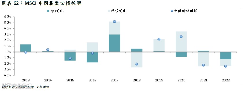 2023年的双位数回报值得期待,但与此同时我们拆解MSCI中国指数的回报来交叉验证。MSCI中国过去连续2年负回报,出现类似场景的是2015、2016年(2016年仅小幅负回报),紧接其后的2017年MSCI中国指数全年回报就大幅提升至超过50%。在经历了2021、2022连续两年的双位数负回报后,我们应该对2023年的正回报抱有相对乐观的态度。
