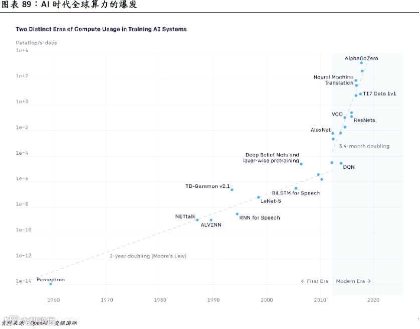 换挡过程中,对于半导体行业的硬件渴望很可能是被市场所远远低估的,在PC-智能手机时代,平均18-24个月的“摩尔定律”在AI时代正在被改写。根据OpenAI的测算,AI算力自2012年以来已经增长了30多万倍,平均每3.4个月算力翻倍。而Chatgpt的落地以及所引发的“算力竞赛”很可能会被进一步加速,市场切不可低估了算力的指数级增长。