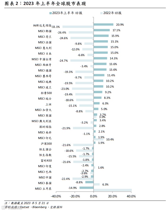 就全球股市而言,除了几个新兴市场以外,2023年上半年相比2022年,绝大部分市场显现出较为明显均值回归的势头,在2022年表现不佳的市场在2023年上半年多数都明显反弹,尤其是欧美市场,其中在2022年位居全球尾部的纳斯达克指数,在2023年上半年变为全球唯一收益超过20%的股市;而中国股市不论是A股还是港股在2023年上半年都表现平平,录得微幅上涨或下跌。