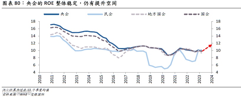 2016年后,包括央企在内的国企ROE整体回落至相对稳定的水平,央企的ROE大概8.5-11%左右的区间波动,通过盘活存量(提升资产周转率),垂直化、专业化整合(提升净利润率水平),提升管理效率(提升净利润率水平)等手段,央企的ROE回升可期。