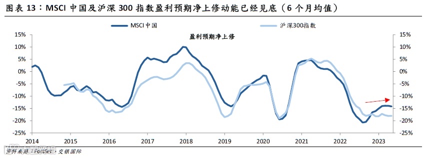 从企业盈利来看,不论是MSCI中国指数,还是沪深300指数,盈利预期的净上修动能都出现了见底迹象,这是积极信号,可以与宏观层面的信息进行交叉验证。但2023年以来沪深300指数与MSCI中国指数的盈利净上修动能仍在低位,这显示市场对于盈利预期依然谨慎。