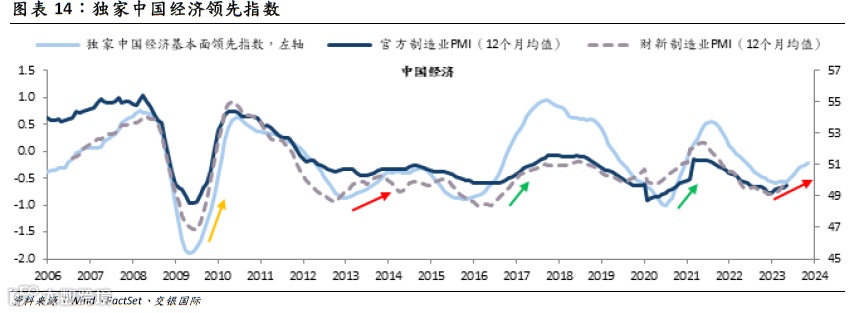 ▍我们独家的中国经济领先指标显示,2023年中国经济上行平缓修复,类似2013-2014年