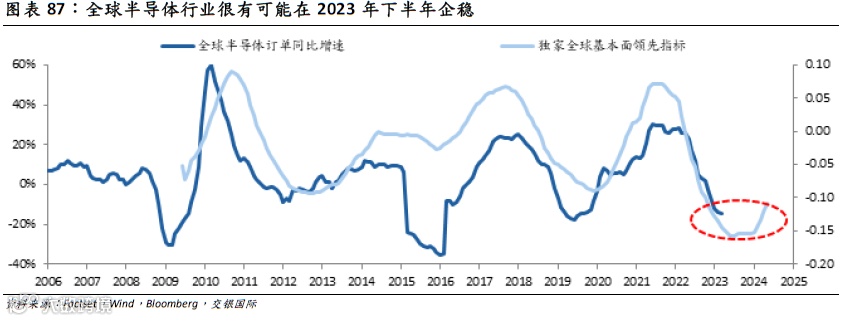 全球半导体订单量自2022年末见顶滞后,一路下滑至今。但其已经愈发接近基本面的底部了。其与全球经济周期关联紧密,伴随着全球经济有望在2023年下半年触底,全球半导体周期也有望同步见底。