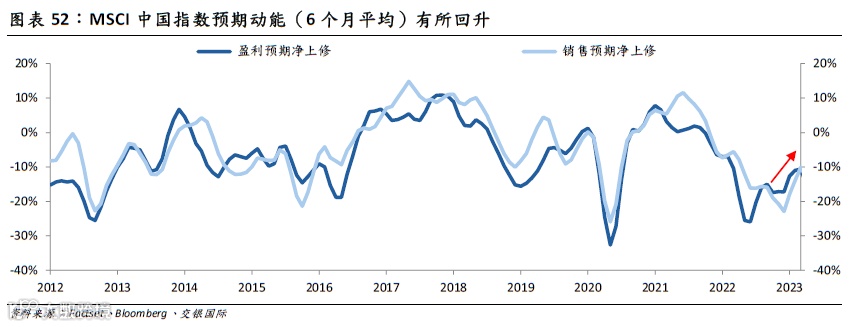 我们测算了MSCI中国指数的盈利预期净上修动能、销售预期净上修动能(即市场预期中上调与下调的相对差值),不难发现不论是盈利还是销售预期都自极低的水平平缓修复,整体的市场预期仍然不高,但我们对于销售预期比市场稍微乐观。