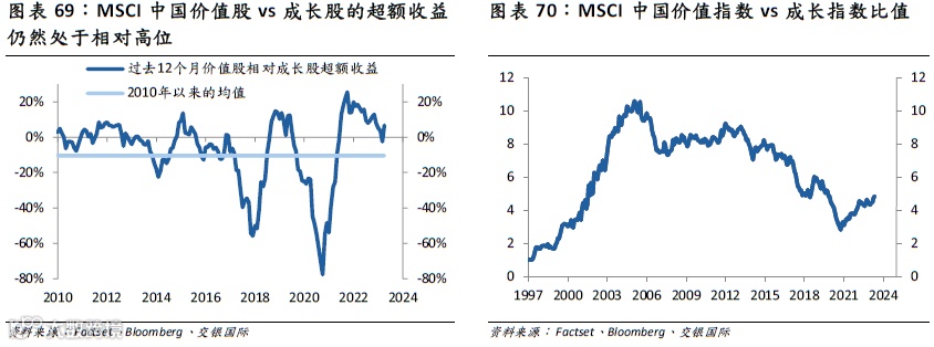 就风格来看,在利率上行之际,长久期、高估值的成长股受到的冲击无疑最大。2022年无疑是MSCI中国指数价值股继续跑赢成长股。虽然过去12个月的超额收益目前已经从高位回落,但目前仍然处于高位水平。