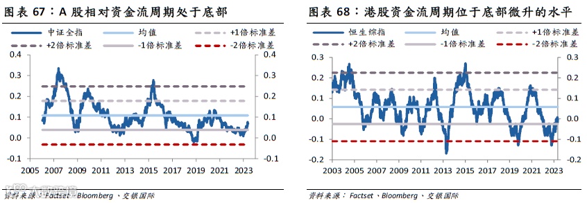 从资金流视角而言,我们从个股层面的资金流独家构建了日度的高频资金流追踪体系,并囊括计算了A股(超过4000只股票,市值超70万亿人民币)、港股(超过2500只股票,市值超过40万亿港币)的资金流周期。该指标可以较好地捕捉资金流的变化,借助资金流周期可以更好地捕捉市场的底部、顶部。根据我们的测算,不论是A股还是港股,当前仍然属于资金流的向上周期中,这将对回报率构成支撑作用。