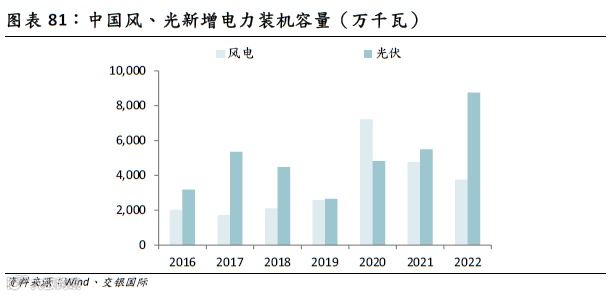 在过去几年,风电、光伏的新增电力装机容量出现飙升,尤其是光伏的装机容量,自2019年连续四年出现新增装机容量加速上涨的态势。