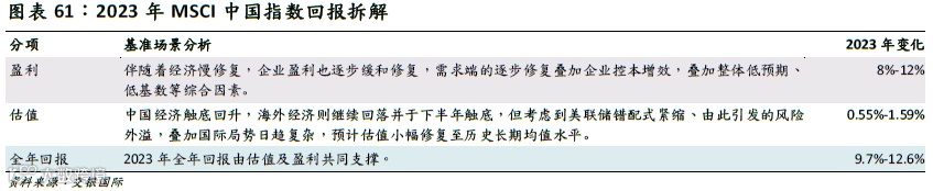 综上,我们预计,2023年MSCI中国指数盈利同比增长8%-12%,而估值小幅修复0.55%-1.59%。MSCI中国指数回报预计为9.7%-12.6%。
