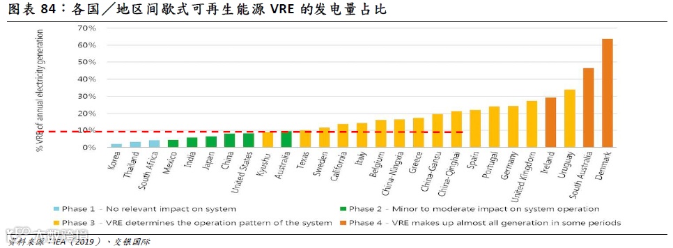10%这一阈值水平很可能非常重要,是“量变”到“质变”的关键阈值。根据EIA的数据显示,VRE的占比高低,将对整个电力系统产生不同水平的影响,VRE占比越低,对于电力系统的影响越小,但当各国/地区的VRE占比超过10%这一阈值水平,VRE将直接影响到电力系统的运行形态。