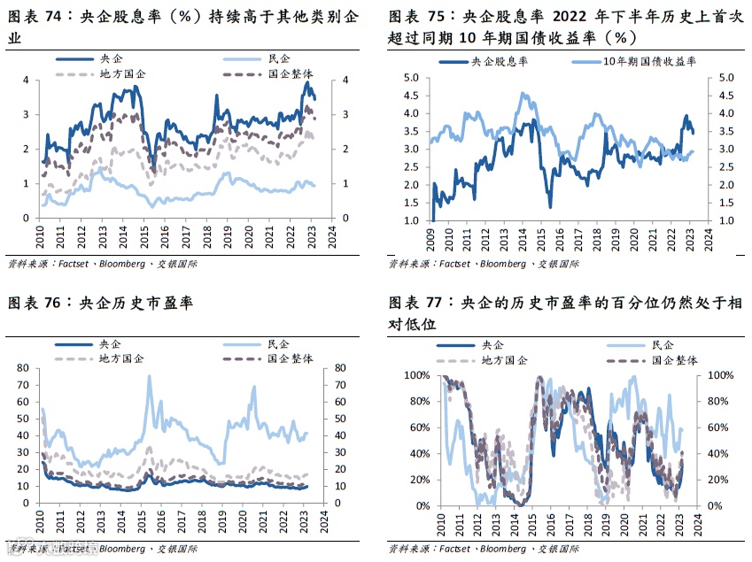 • 央企的股息率长期来说持续高于其他类别企业,相比于民企高出近2.4个百分点。央企的高股息率无疑令其扮演了权益类资产中“类债”的角色,2022年下半年央企的股息率更是历史上首次持续超过同期的10年期国债收益率。尤其是考虑在人口结构变化推动利率中枢下移的大背景下、居民资产、养老金等战略性提升权益资产配置比例,其高股息率的特性无疑将成为长线资金入场的首选,长线资金的配置也将有助于熨平波动,增强央企股票的防御性。