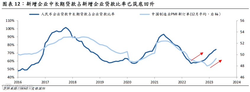 * 另一个交叉验证的角度是,我们测算了新增企业中长期贷款占新增企业贷款的比率,中长期贷款的占比可以较好地反映企业的信贷需求,以及对于整体需求乐观度,因此可以作为反映需求的间接变量,我们可以看到,该比值与制造业PMI新订单指数高度相关。而新增企业中长期贷款占新增企业贷款的比率正在稳定而缓慢的上行修复中,这反映经济在宽信用的推动下,正在逐步修复。