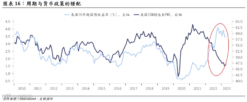 作为周期表征的美国ISM制造业PMI vs 10年期国债利率出现了明显的错配,正是此次错配下“非典型紧缩”的最佳例证。