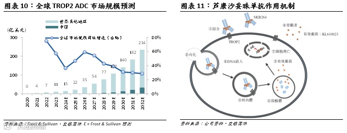 芦康沙妥珠单抗(SKB264)是由公司自主发现并开发的TROP2 ADC。TROP2经常在多种癌症(包括乳腺癌、NSCLC、胃癌及卵巢癌等高患病率或高死亡率癌症)中过度表达,因此靶向TROP2的药物拥有巨大市场潜质。沙利文预计全球TROP2 ADC市场规模将从2023年的11亿美元增长到2032年的140亿美元,CAGR达到41.0%,而随着进口和国产TROP2 ADC相继获批上市,中国内地TROP2 ADC市场规模有望于2032年达到34亿元人民币,CAGR达到91.8%。