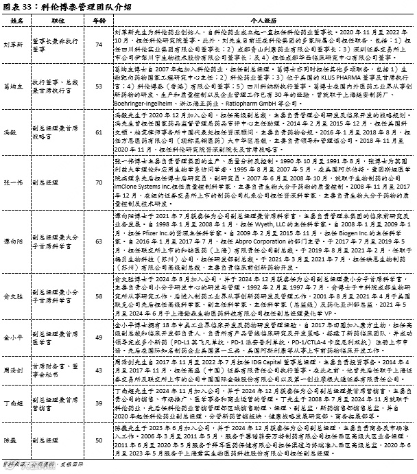 公司董事长刘革新为科伦药业创始人,在医药领域有超过30年的从业经验, 首席执行官葛均友博士曾主导30余项创新药研发及全球多中心临床,首席战略官冯毅融合药监审评经验与临床开发资源,形成“研发-政策-商业化”全链条管理能力。团队骨干多来自辉瑞、礼来、阿斯利康等跨国药企及国内头部Biotech,如首席科学官谭向阳(前辉瑞/Biogen高管)、生产负责人张一伟(前礼来资深专家)、首席医学官金小平(阿斯利康/康方生物背景),覆盖从研发、生产到上市的全周期运营。