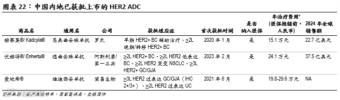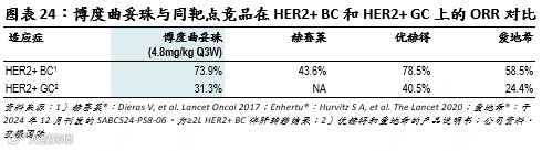 博度曲妥珠是一款公司内部开发、有潜力治疗HER2+ 实体瘤的差异化HER2 ADC,目前处于NDA审评阶段,用于HER2+ BC的治疗(≥3L适应症于2023年5月获受理、≥2L适应症于2025年1月获受理)。我们预计,博度曲妥珠有潜力成为首批获批治疗晚期HER2+ BC的国产ADC之一。HER2是一种细胞表皮受体,在各种正常组织中的表达低,但其过度表达和异常激活将促进细胞异常生长和存活,进而导致BC、GC等各种癌症的发展。