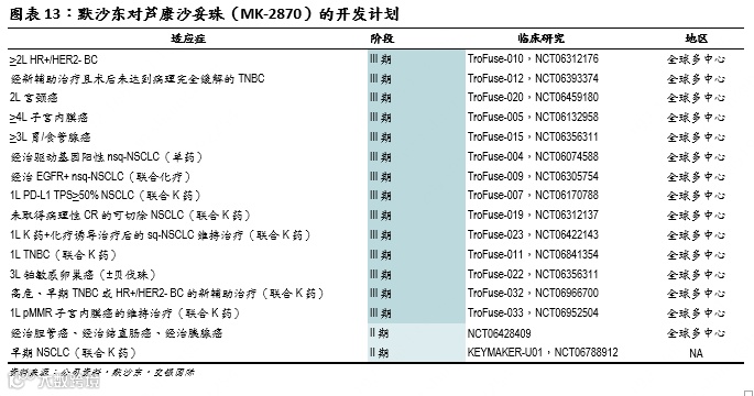 芦康沙妥珠是全球第二款获批的TROP2 ADC,大中华区以外权益已授权给默沙东。截至目前,默沙东已开展多项针对芦康沙妥珠的临床研究,包括针对NSCLC、子宫内膜癌、胃腺癌、宫颈癌、卵巢癌等适应症的国际多中心III期研究,有望借助差异化的适应症布局、弯道超越Trodelvy和Datroway。