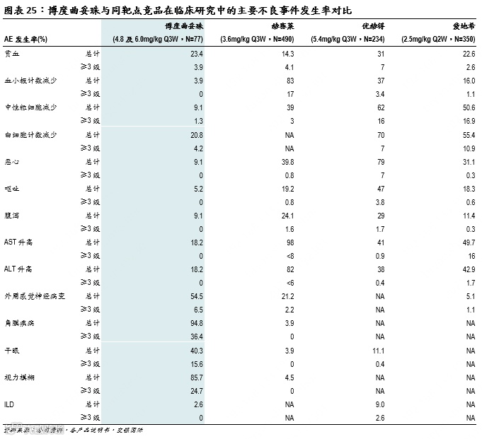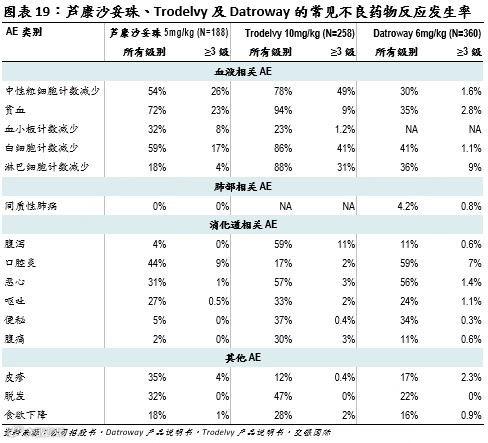 优异安全性数据有望扩大临床应用机会:在各自的获批剂量下,芦康沙妥珠的大部分AE发生率低于Trodelvy。例如,FDA对Trodelvy施加黑框警告,治疗过程中可能出现中性粒细胞计数减少和腹泻两种严重不良反应风险。而在临床试验中,芦康沙妥珠导致的上述两种不良反应的发生率明显更低。相比Datroway,芦康沙妥珠导致间质性肺病的风险也明显更低(阿斯利康/第一三共的另一款ADC Enhertu因间质性肺病风险遭FDA黑框警告)。更优异的安全性有望带来更宽阔的治疗窗口,给予医患更多剂量选择空间,并提升产品相对于同靶点竞品的整体竞争力。