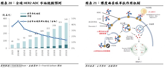 据各种文献统计,在乳腺癌、卵巢癌、胃癌、食管癌、NSCLC等患者群体较大的癌种中,HER2+(IHC 3+或IHC 2+/ISH-)的病例占比分别达到15-30%、20-30%、9-38%、7-22%、7-23%。因此,HER2靶向疗法的市场潜力十分可观。全球范围内已有多款HER2靶向药物获批上市,但仍有大量患者无应答、出现治疗耐药性或出现严重副作用。这些限制凸显了对可延长复发/难治患者生存期的新型疗法(包括HER2 ADC)的需求。沙利文预测,到2032年,全球HER2 ADC市场规模有望达到345亿美元,其中中国内地市场达到50亿美元。