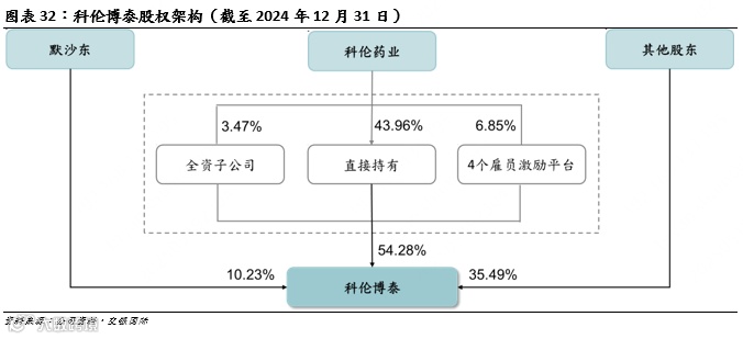 截至2024年12月31日,科伦博泰的控股股东为科伦药业,其通过直接及间接方式合计持有科伦博泰约54.28%的股权(其中直接持股43.96%,通过科伦药业全资附属公司科伦国际及四个雇员激励平台共持股10.32%)。第二大股东为默沙东,持股比例为10.23%。总体股权架构呈现高度集中的特点,科伦药业通过直接控股和员工激励平台形成了稳固的控制权。