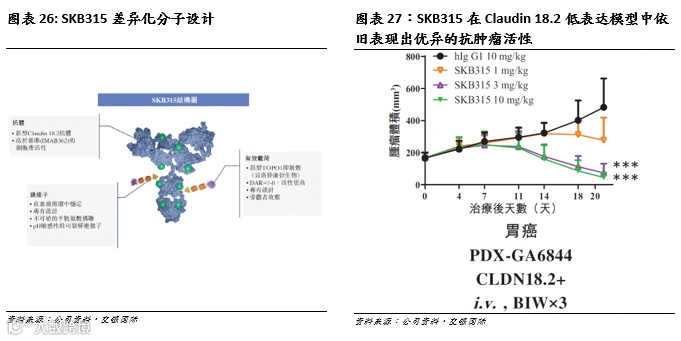 一款针对晚期实体瘤治疗的新型Claudin 18.2 ADC。Claudin 18.2是一种细胞连接蛋白,在胃癌、胰腺癌等难治且治疗手段肿瘤中存在过度表达,因此应用前景可观。当前Claudin 18.2 ADC竞争格局较激烈,至少有20款候选药物处于临床开发阶段。SKB315目前处于中国内地I期临床研究中,核心竞争优势在于: