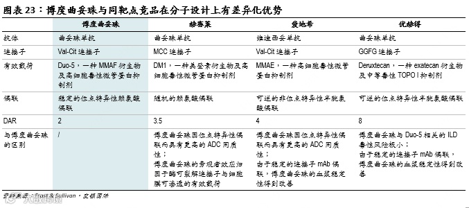 从分子设计上看,博度曲妥珠相比主要竞品的差异化之处在于:1)通过较低的DAR值、稳定的位点特异性偶联和高细胞毒性的有效载荷Duo-5,产品有望在保证疗效的前提下,提升血浆稳定性和安全性;2)位点特异性偶联保证ADC同质性,生产过程中的制剂均一性也相应提升。