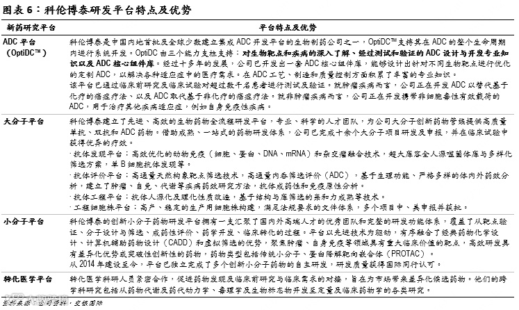 科伦博泰的新药发现和研发的基石在于其三大技术平台,分别专注于ADC、大分子和小分子药物。此外,转化医学平台推动药物发现和临床前研究与临床需求的对接,各平台通力合作,持续产出差异化显著的候选药物。