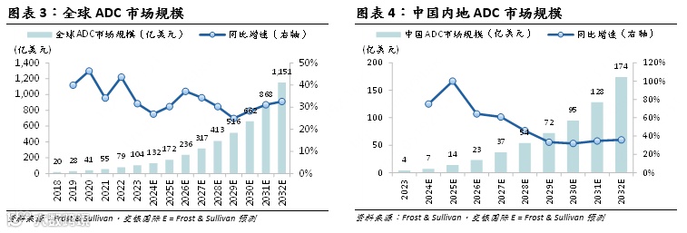 随着今年来ADC产品开始在全球各地获批上市,它们显著的抗肿瘤疗效推动市场规模快速增长。根据沙利文预测,全球ADC市场规模于2024年达到132亿美元, 2032年达到1,151亿美元,在中国内地,ADC的发展阶段相对更早期、市场规模更小,增长潜力更可观,2024-32年CAGR有望达到60%。