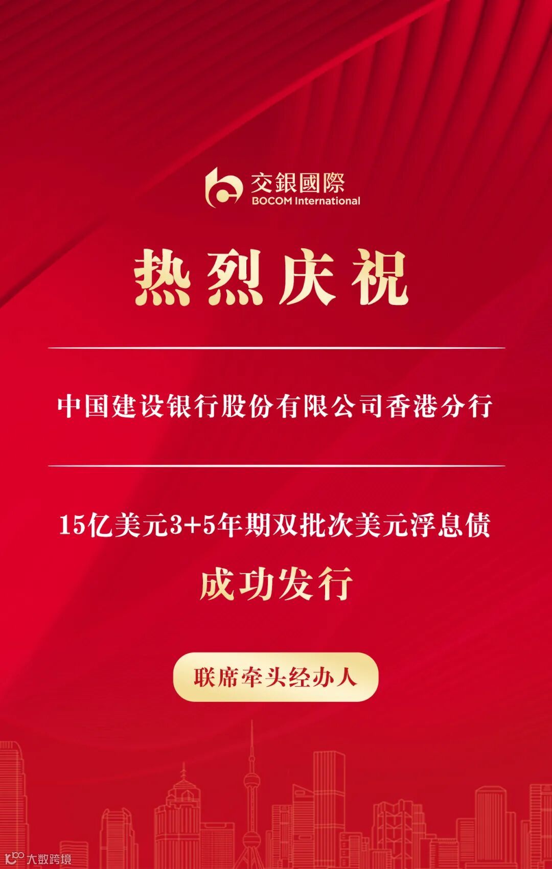 5月21日,交银国际作为联席牵头经办人助力中国建设银行股份有限公司香港分行成功发行15亿美元3+5年期双批次美元浮息债。此次发行中,3年期美元债(10亿美元)初始价格指引为SOFR+105基点区间,最终发行利差为SOFR+52基点,大幅收窄53个基点;5年期美元债(5亿美元)初始价格指引为SOFR+115基点区间,最终发行利差为SOFR+60基点,同样显著收窄55个基点。该笔债券受到投资人广泛关注,市场反应热烈,发行当日中午,订单金额已超过38亿美元,下午峰值更超过47亿美元,超额认购逾3倍。