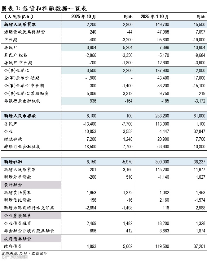 本文节选自交银国际已发布研究报告《10月新增人民币贷款/社融同比少增,期待政策性工具效果显现 》(2025/11/14)。