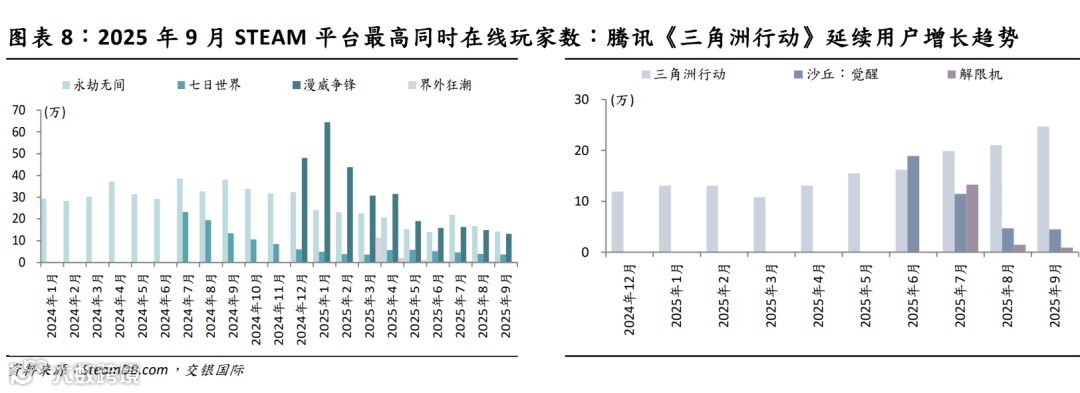 腾讯《三角洲行动》热度持续攀升, 9月STEAM最高同时在线人数环比增17%至24.7万,再创上线以来新高。另外,腾讯在该游戏一周年庆典(9月21日)宣布国服日活用户超3,000万,较7月平均日活增加1,000万,延续快速增长势头。