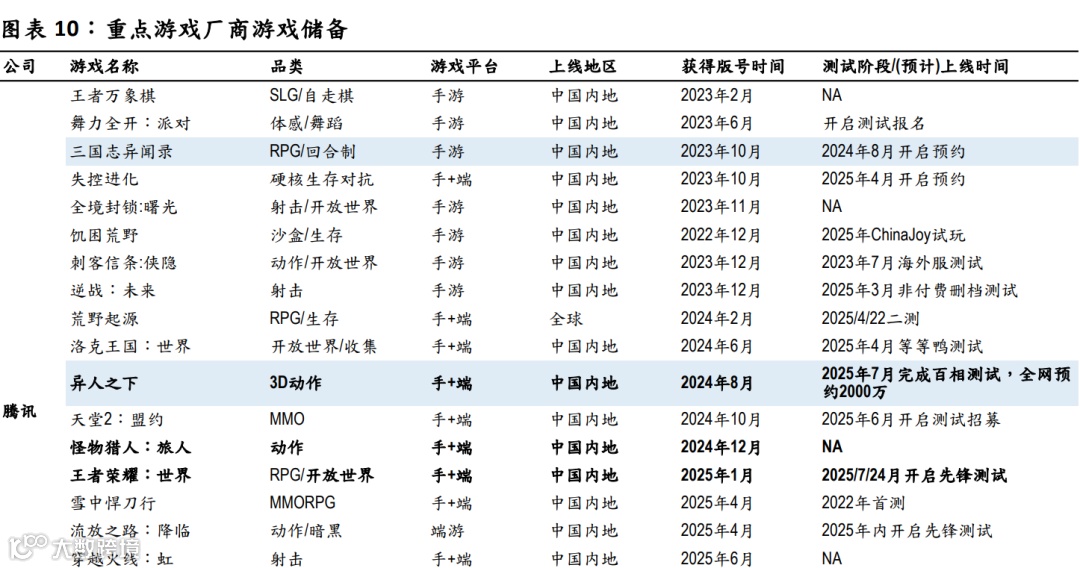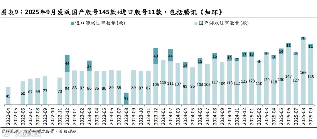 2)2025年9月发放国产版号145款+进口版号11款,关注腾讯开放世界RPG跨端游戏《归环》及米哈游崩坏系列新游《崩坏:因缘精灵》测试进度及上线计划。