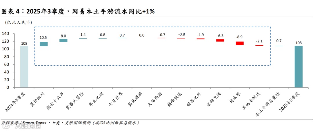 本土流水同比微增0.7亿元/1%,《燕云十六声》等新游及《蛋仔派对》增量贡献抵消《逆水寒》等高基数影响。海外流水同比增1.6亿元/18%,受益于《Destiny:Rising》(9月流水破亿元)/《漫威秘法狂潮》等新游流水增量贡献。
