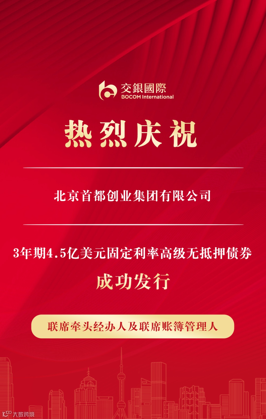 3月13日,交银国际作为联席牵头经办人及联席账簿管理人助力北京首都创业集团有限公司(“首创集团”)发行3年期4.5亿美元固定利率高级无抵押债券。本次发行于3月14日启动,初始价格指引为7.75%区间,簿记建档开启后,市场反应热烈,中午前订单规模已突破30亿美元,下午峰值更是达到48亿美元。最终定价7.15%,较初始价格指引大幅收窄60个基点,以超10倍认购成功发行了目标4.5亿美元债券。
