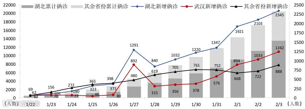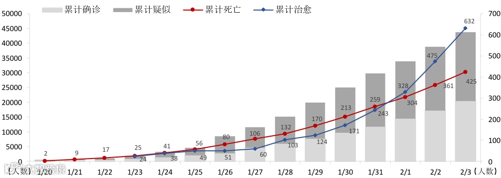 截至2月3日24时,中国内地已确诊20,438例新型冠状病毒肺炎,疑似病例总数上升至23,214例。数据显示新型冠状病毒感染病例仍处于上升阶段。但我们看到总治愈人数于2月1日超过总死亡人数,且治愈人数持续大幅增长。此外,核算提取方式改良后,检测时间最快已经缩短至2个小时,大幅提高确诊速度。而武汉火神山医院也于2月3日正式完工并开始收治确诊的新冠患者,雷神山医院也将于2月5日建成。如果这些进展持续,那么疫情的控制虽仍艰巨,但或已出现了一丝曙光。当然,随着春节后返城的人流开始上升,疫情控制的第二高峰期仍任重道远。