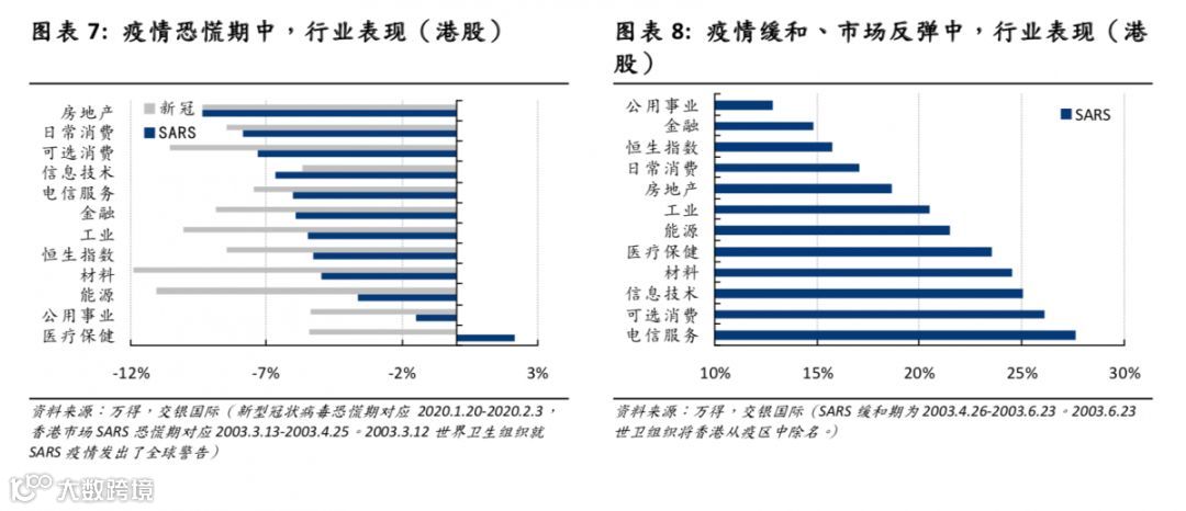 医药行业方面,我们认为新冠病毒疫情虽带来短期股价压力,但大大刺激医疗用品需求,包括药品和医疗设备。制药公司将长远受益。此外,线上和线下医疗服务呈现协同效应。在湖北省医院超负荷的情况下,阿里健康、平安好医生等平台免费提供在线咨询,减轻线下医疗机构负担,展现了互联网医疗在公共教育、疾病预防、初步诊断和患者分流方面的巨大潜力。