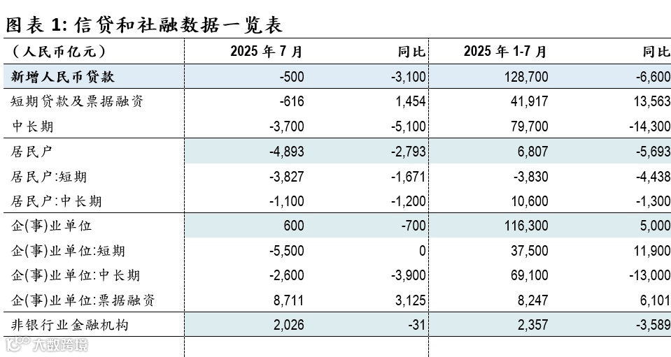 7月新增人民币贷款净减少500亿元,同比少增3100亿元,主要由于7月本身为淡季,信贷需求偏弱,叠加信贷投放前置、债务置换等因素影响