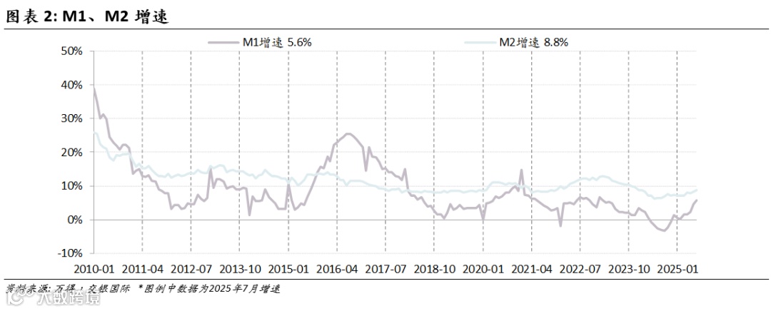 7月M1增速(2025年1月统计口径更新,新加入个人活期存款、非银行支付机构客户备付金)为5.6%,环比继续回升1个百分点,主要受低基数影响;M2增速为8.8%,环比提升0.5个百分点;社融余额增速为9.0%,环比提升0.1个百分点。