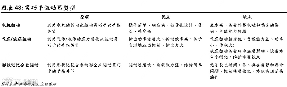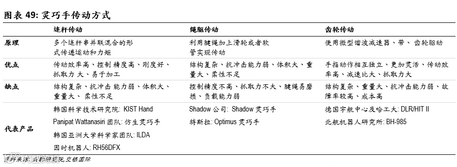 根据传动方式分类,有腱传动、连杆传动、齿轮/蜗轮蜗杆传动。连杆传动广泛用于工业、假肢领域,刚度大,易于强力抓取物体,但重量体积较大,柔性不足。绳驱传动主要用于科研领域和人形机器人领域,灵活度高、结构简单,但控制精度不足,寿命短,已有Shadow等灵巧手落地,也是特斯拉机器人配备的灵巧手类型;齿轮传动主要应用于工业机器人,每根手指可独立操纵,灵活性强,但结构复杂、易发生故障,成本较高。