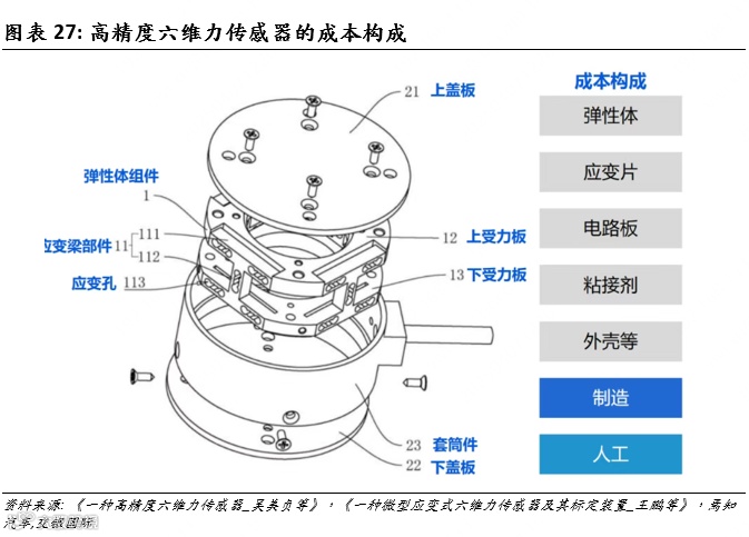 六维力传感器是机器人赛道中成本较高的部件之一,盈利能力强。六维力传感器成本构成包括材料、制造和人工成本,其中超 50%的成本来自于应变片和人工加工成本。六维力传感器价值量高,根据MIR数据,六维力传感器的产品单价可达2-4万元。六维力传感器毛利率处于较高水平,根据柯力传感2023年年报数据,公司传感器毛利率达到 41%。我们预计,随着人形机器人放量,单个六维力传感器产品的价格可能下降至5000元以内。