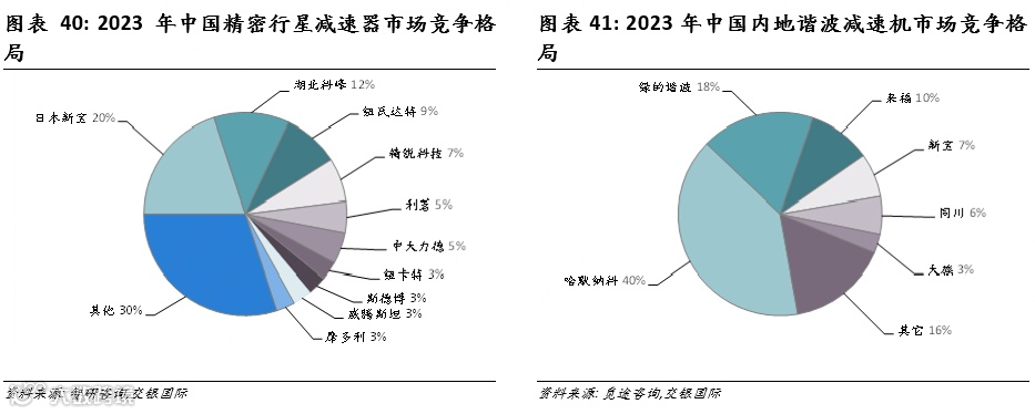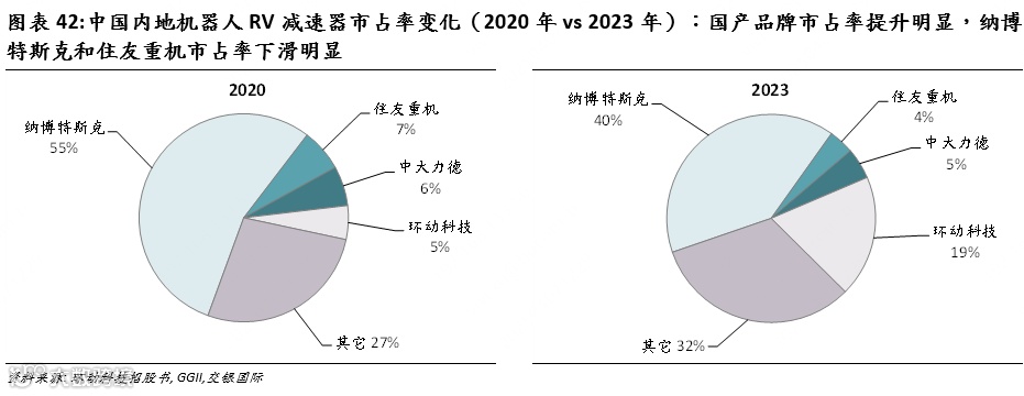 中国内地精密行星减速器市场集中度高, 2023年我国精密行星减速器CR5占比53%,在主要的十家精密行星减速机企业中,外资企业占据70%的市场份额,其中,日本新宝的市场份额最大,占比20%;中国内地企业湖北科峰和纽氏达特市场占有率为12%和9%,排名第二和第三;位于第四和第五位的企业均为台资品牌,精锐科技和利茗,占比分别为7%和5%。中国内地RV减速器市场由日系品牌纳博特斯克占据主导地位,但国产品牌市占率快速提升。根据环动科技招股书,2020-23年,纳博特斯克在中国内地机器人 RV 减速器市场占有率从 54.8%下滑至40.2%;住友重机市占率从6.6%下滑至3.9%。