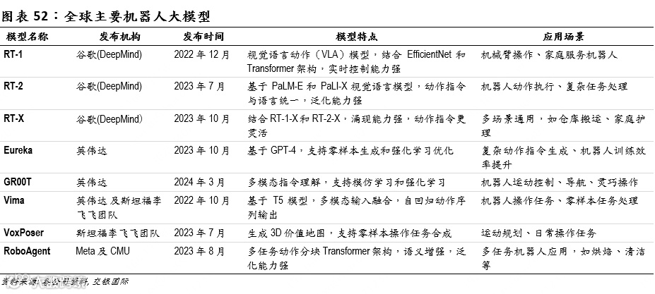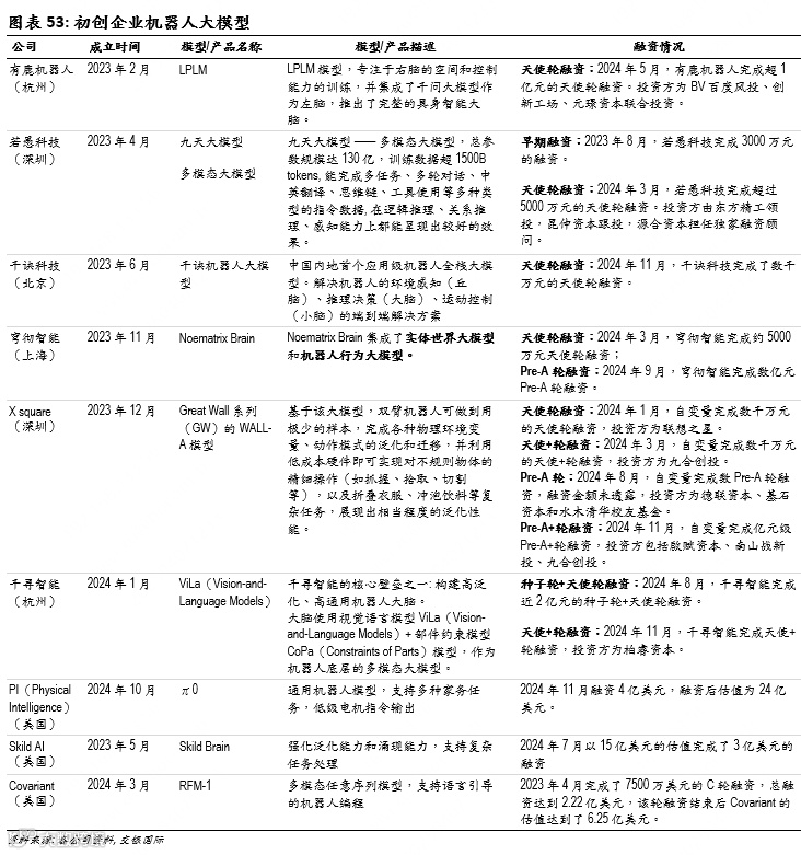 国内外典型的具身智能大模型有谷歌RT-X、Figure AI的HELIX、英伟达GR00T、斯坦福李飞飞团队的VoxPoser 以及Meta 和CMU(卡内基梅隆大学)联合打造的RoboAgent等。中国内地典型的具身智能大 模型有华为盘古大模型、阿里云大模型等。此外,中国内地也涌现了一批初创企业专注于大模型和机器人大脑。